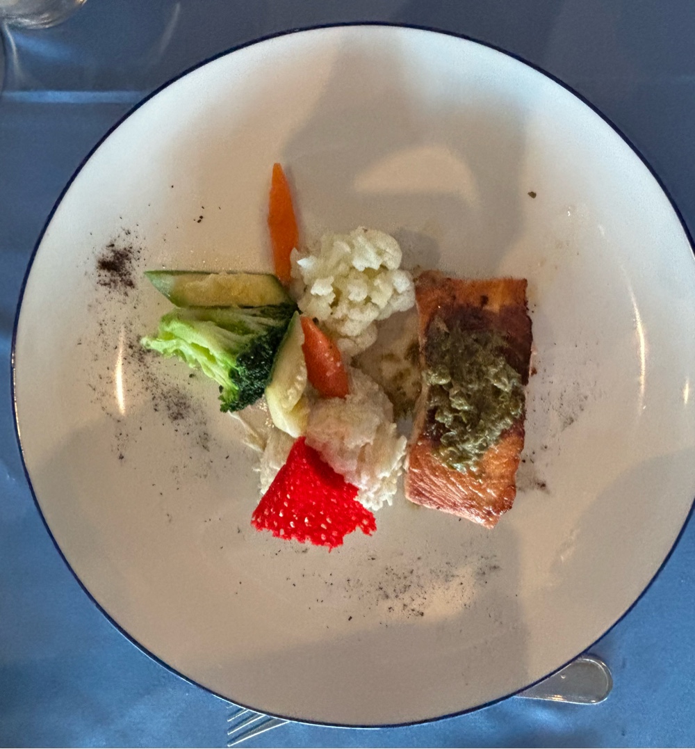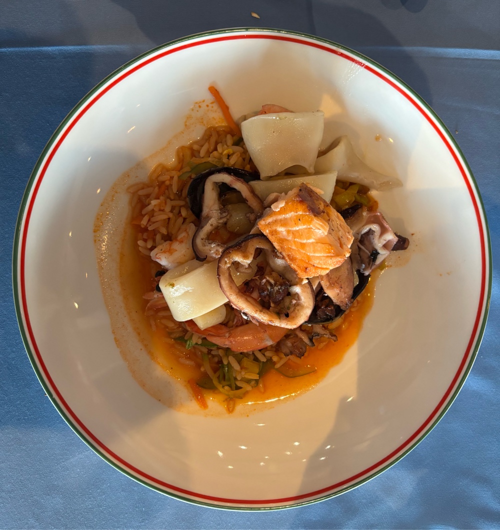David’s seafood grill (above) contained octopus, squid, salmon, shrimp, scallops and mussels. Pam’s salmon dish (below) was equally delicious.