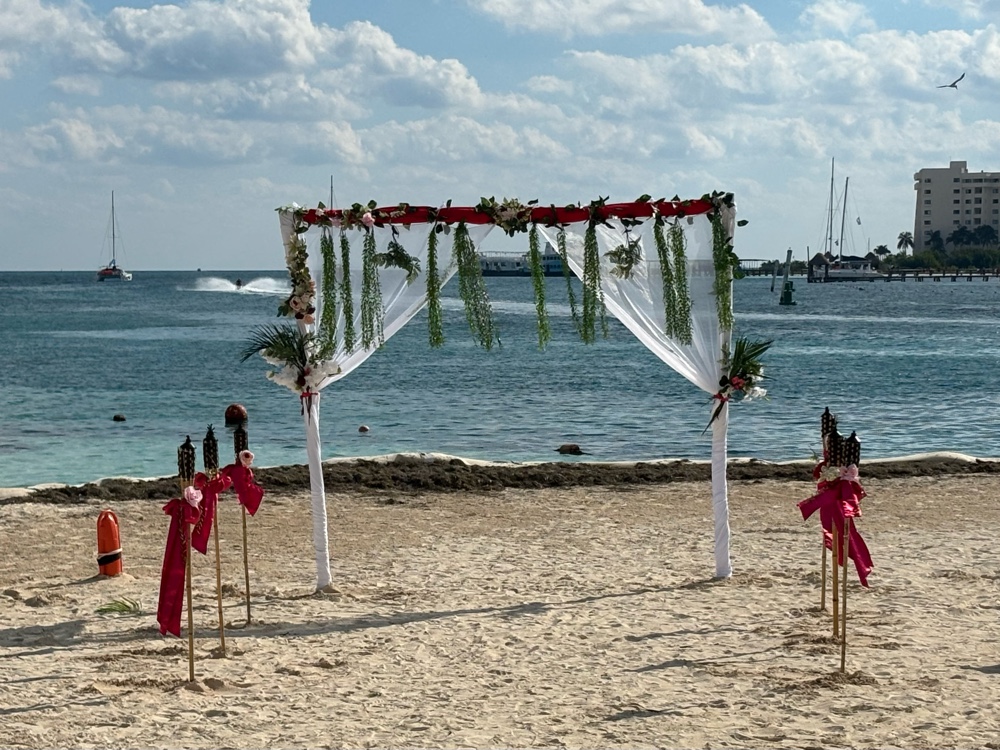 The staff set up a wedding backdrop on the beach this morning.