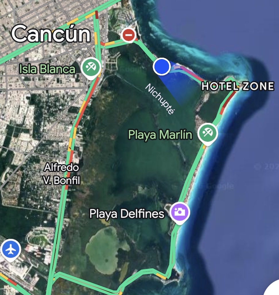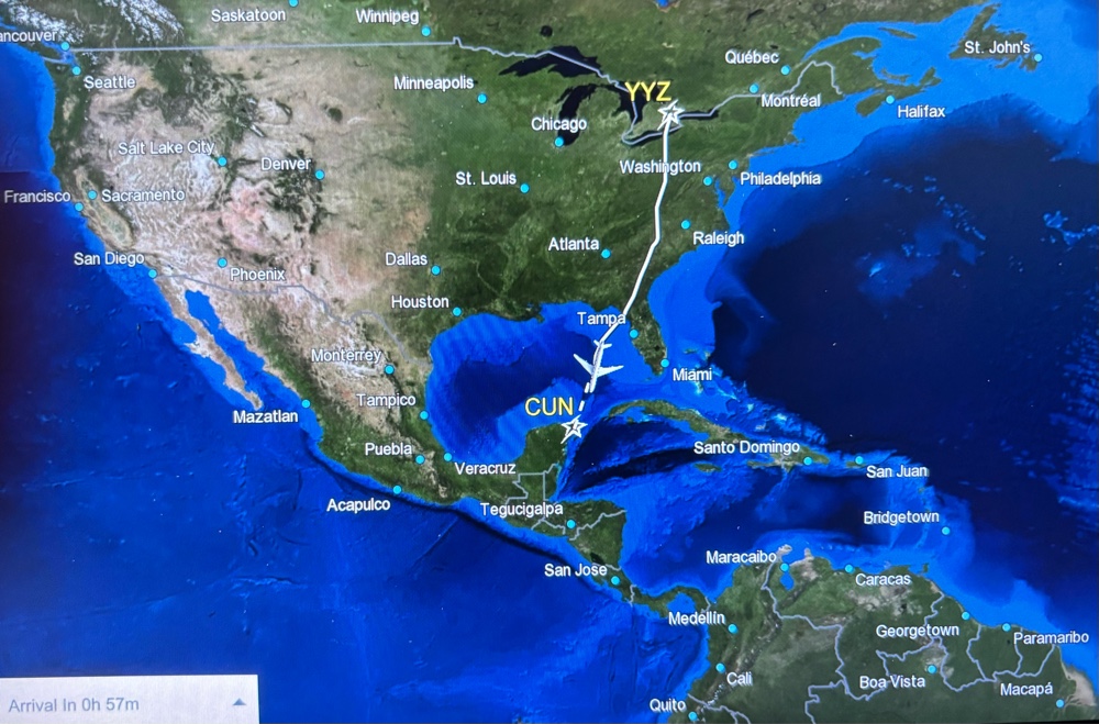 After a stormy week, we had a perfect break in the weather for our trip. Despite a three-hour delay in leaving, it all worked fairly smoothly. We left for Halifax Airport at 6:30PM and were airborne by 9:45PM, arriving at our Toronto Airport hotel at 11:15PM. With three hours of sleep under our belts, we headed back to the airport at 4AM for a 6:15AM departure to Cancun, landing there a bit early, just before 10:30AM. After a frustrating hour of trying to get our e-SIMs to work on our phones and figure out where the Uber pick-up location was, we finally got a lift to the hotel, which is 30 minutes north of the airport.